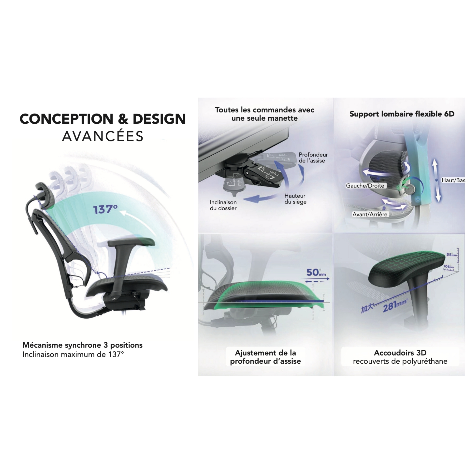 - Dossier flexible à 5 pivots : il suit chaque mouvement de votre dos en temps réel.