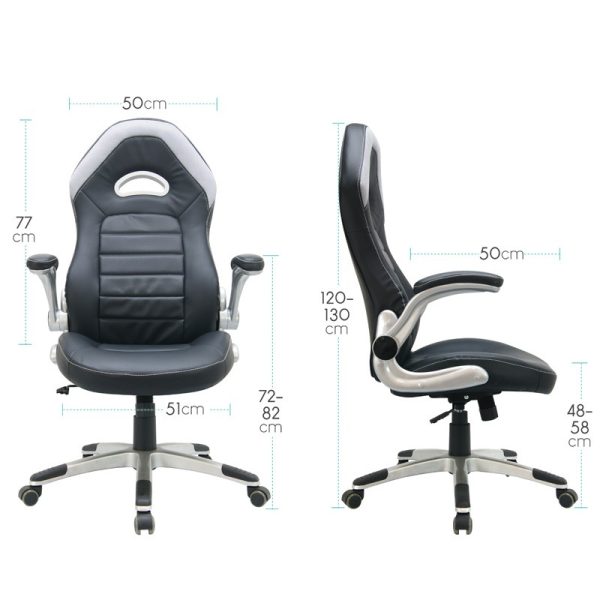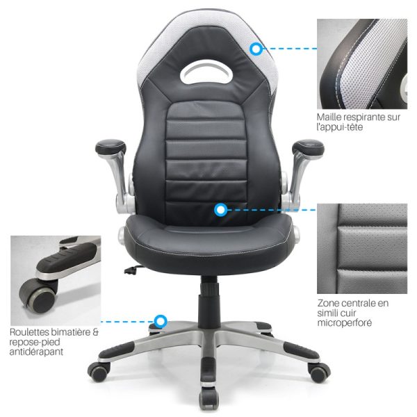 La chaise gaming accoudoirs relevables ERIS propose un design gamer moderne inspiré des sièges baquet. Son revêtement en simili cuir et ses détails gris apportent un style dynamique et élégant.