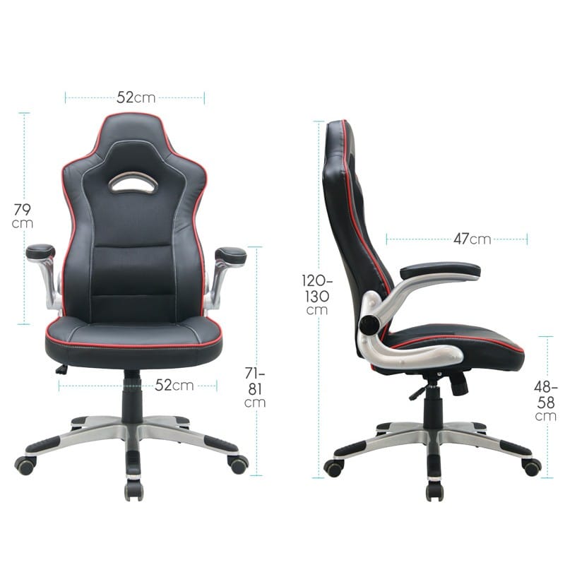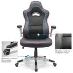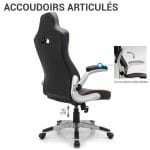 Ce siège gamer se distingue par son piètement chromé avec repose-pieds intégré. Ainsi, vous pouvez poser vos pieds pendant les moments de détente. De plus, les accoudoirs se relèvent à 90 degrés pour gagner de la place. Par conséquent, vous rangez facilement votre fauteuil sous le bureau quand nécessaire. C’est pourquoi ce modèle combine praticité et design gaming réussi.